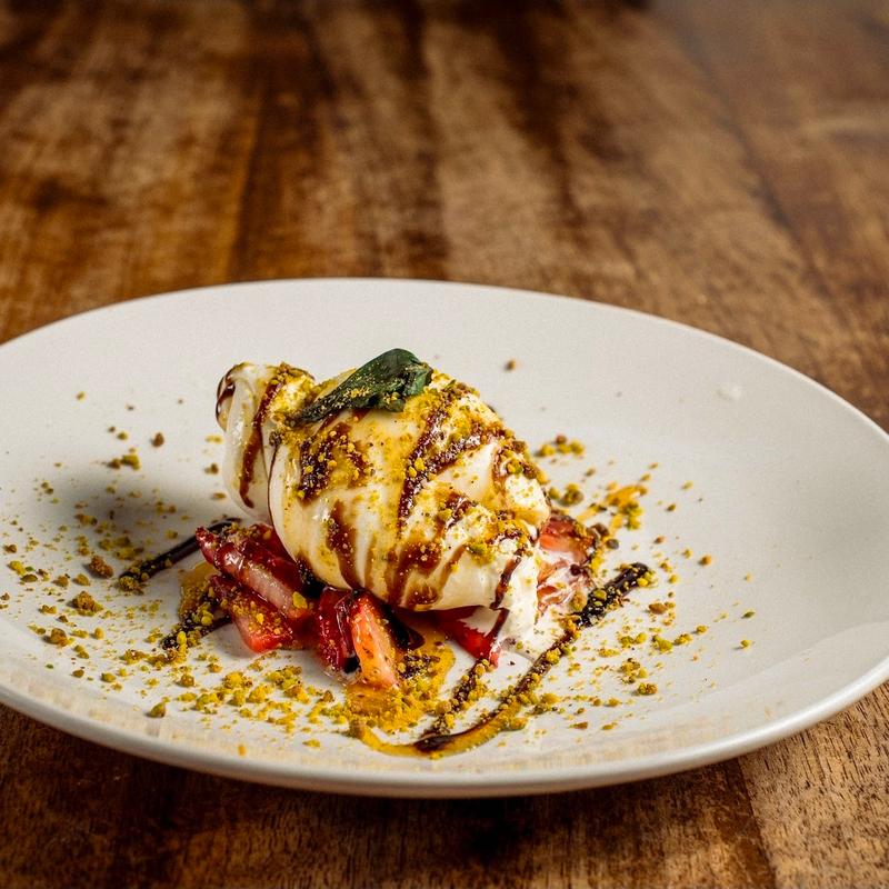 Strawberries, basil, aged balsamic, honey, pistachio soil | Vegetarian upon request | Gluten-free upon request