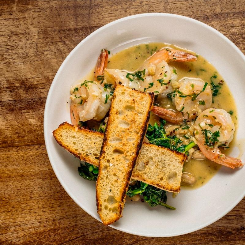 Jumbo shrimp, toasted garlic, cannellini beans, broccoli rabe, lemon, calabrian chili, herbed focaccia | Gluten-free upon request