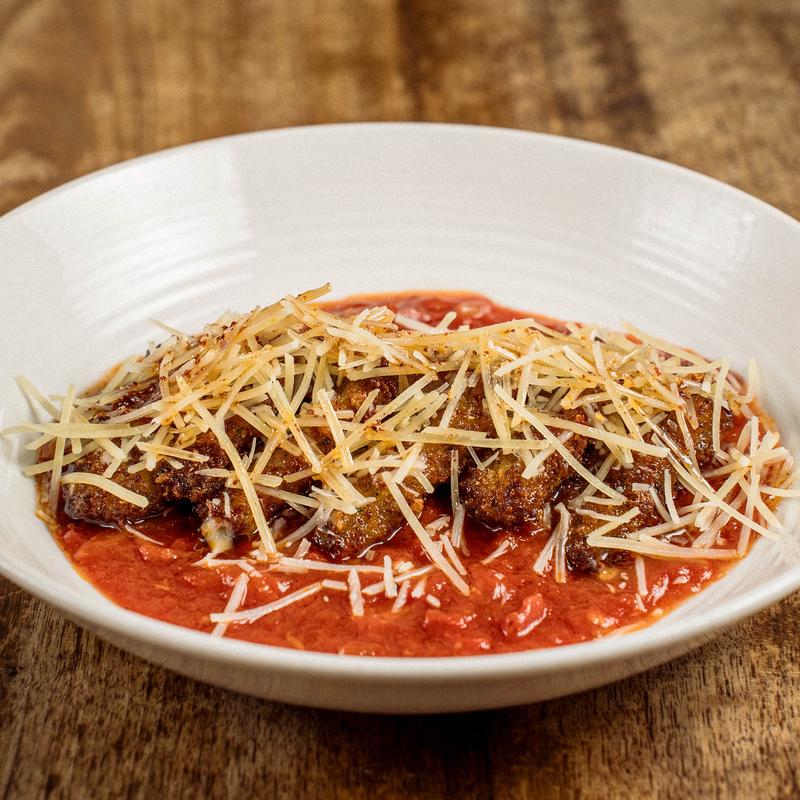 Panko-crusted fresh mozzarella, peperonata sauce, parmigiano-reggiano, basil-infused hot honey | Vegetarian upon request