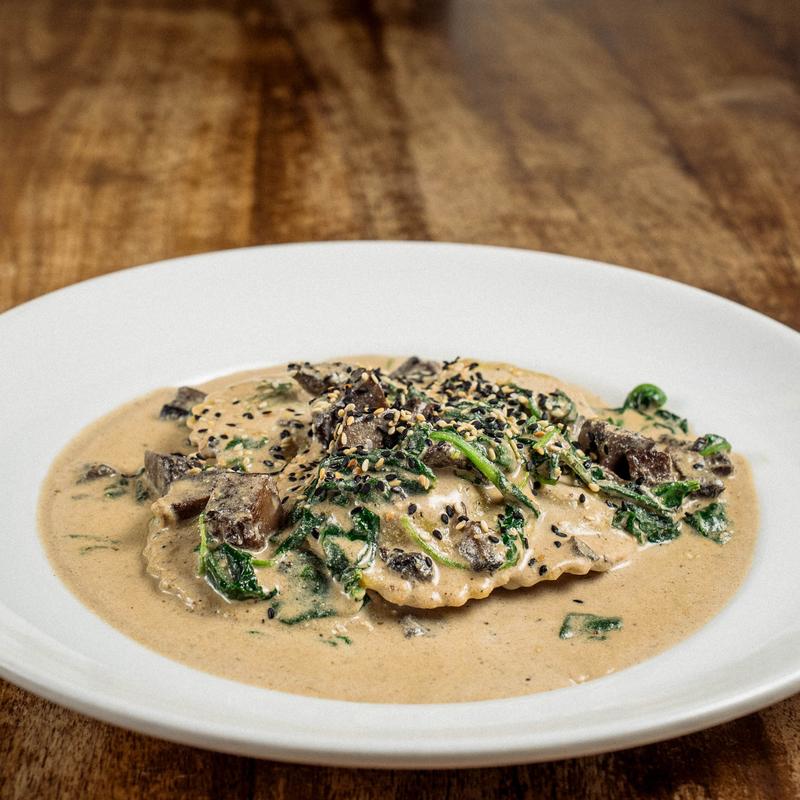 Mushroom-shallot duxelle stuffing, black garlic fonduta, sautéed baby spinach, toasted tuxedo sesame seeds | Vegetarian upon request