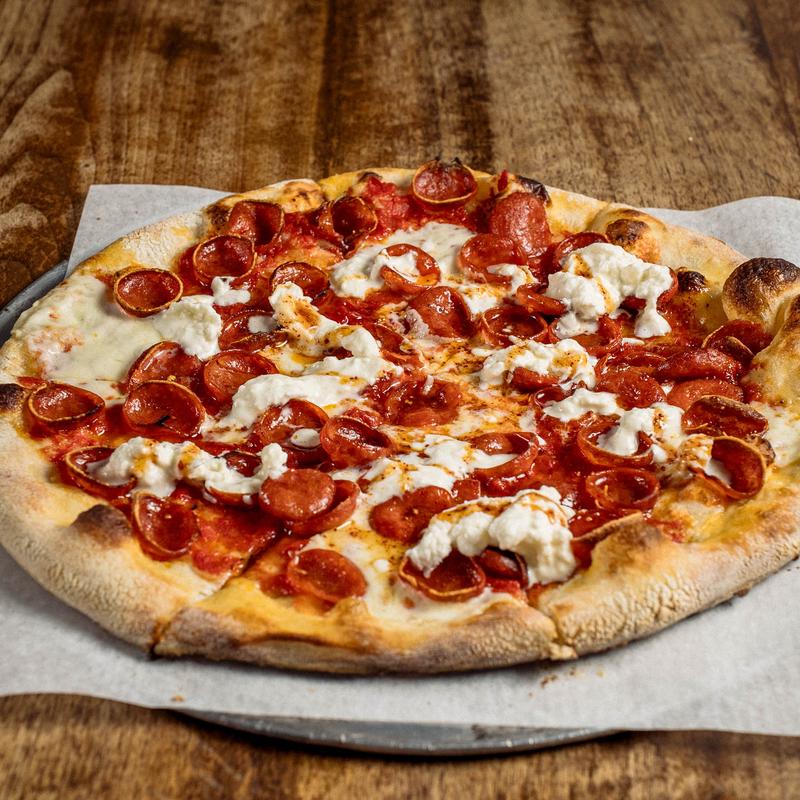 Crushed tomato sauce, fresh mozzarella, stracciatella, cup and char pepperoni, basil-infused hot honey