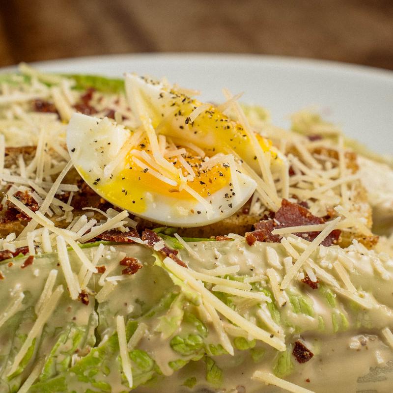 Romaine hearts, prosciutto crisps, and jammy farm egg. sourdough tuille, parmigiano-reggiano, house Caesar | Gluten-free upon request