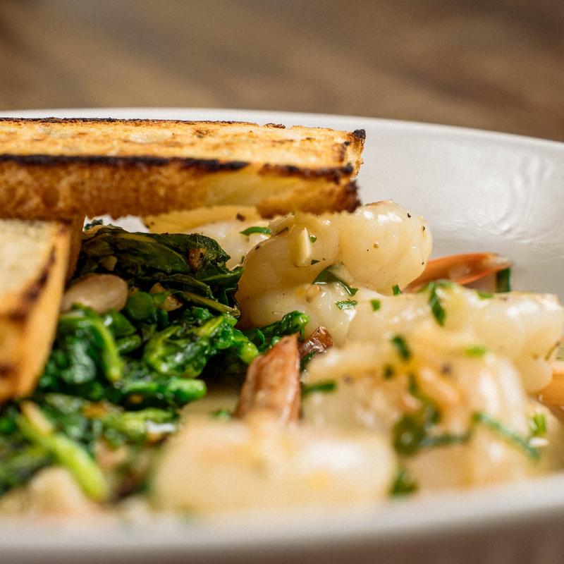 Jumbo shrimp, toasted garlic, cannellini beans, broccoli rabe, lemon, calabrian chili, herbed focaccia | Gluten-free upon request