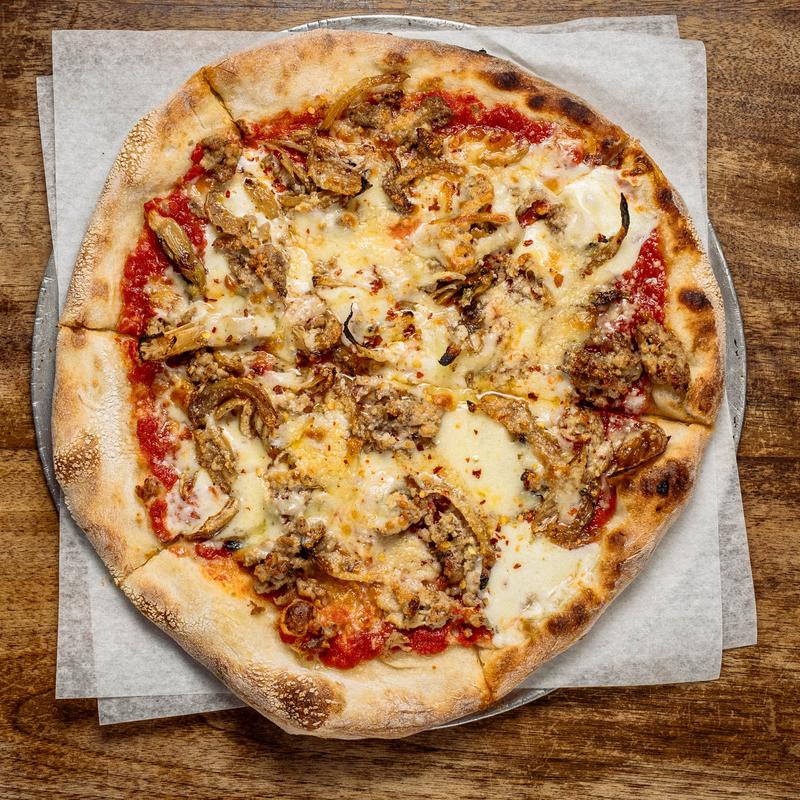Crushed tomato sauce, provolone, house made sausage, roasted fennel, garlic confit, red chili flakes