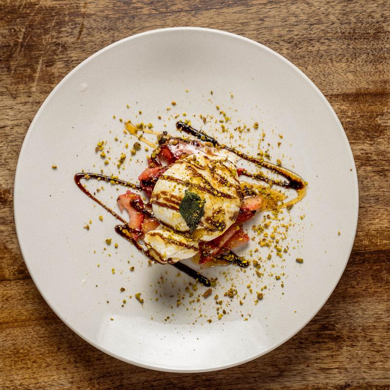 Strawberries, basil, aged balsamic, honey, pistachio soil | Vegetarian upon request | Gluten-free upon request